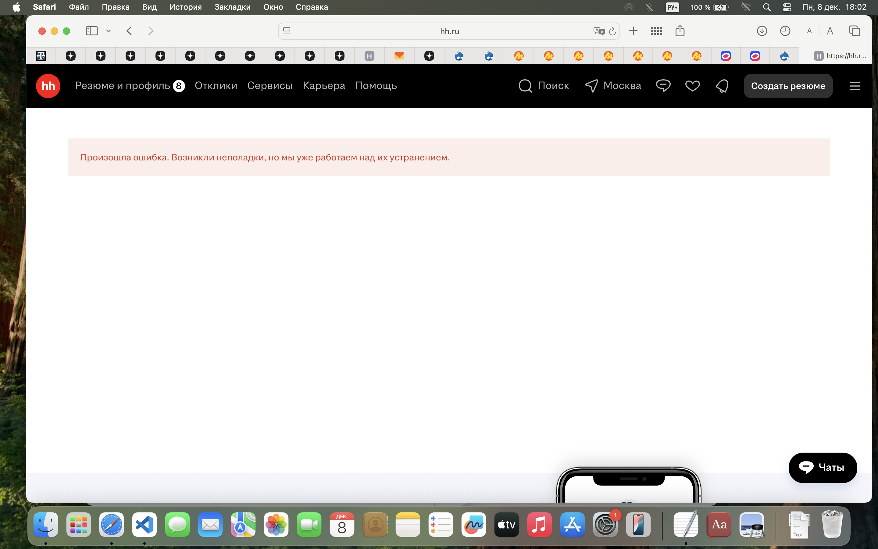 Захожу в свой профиль на ХедХантере, и в который раз вижу строчку: "Вы не можете просматривать это резюме, так как пользователь скрыл его.". Кликаю по резюме - на что в ответ вылазит другая строчка: "Произошла ошибка. Возникли неполадки, но мы уже работаем над их устранением". Оба скрина в блоке. Я спокоен! Причем абсолютно! Вы собрались загнать меня в дерьмо? Вы меня в него не загоните. - (18:10) - Тупорылые! Просто пипец, до чего тупорылые!