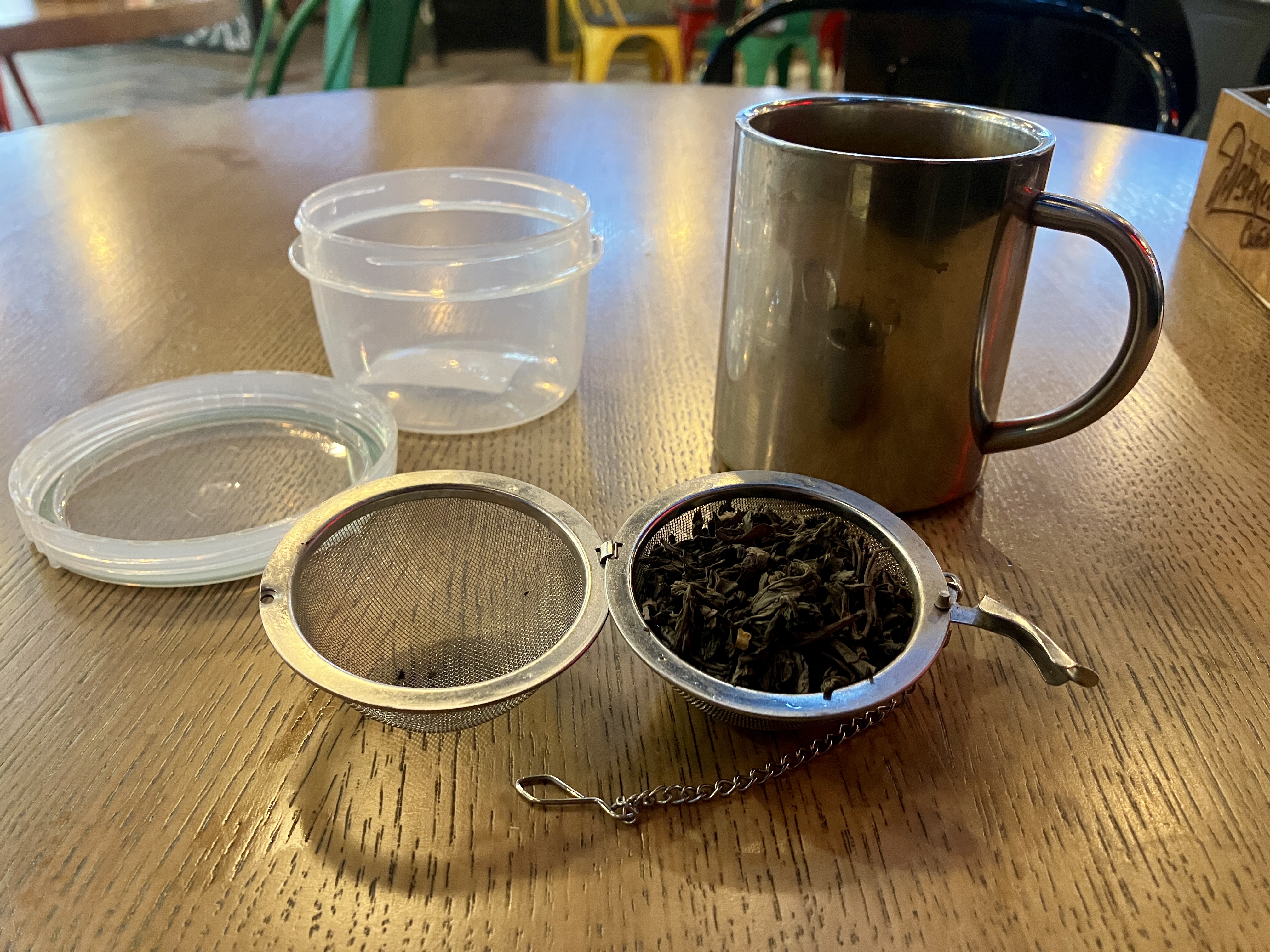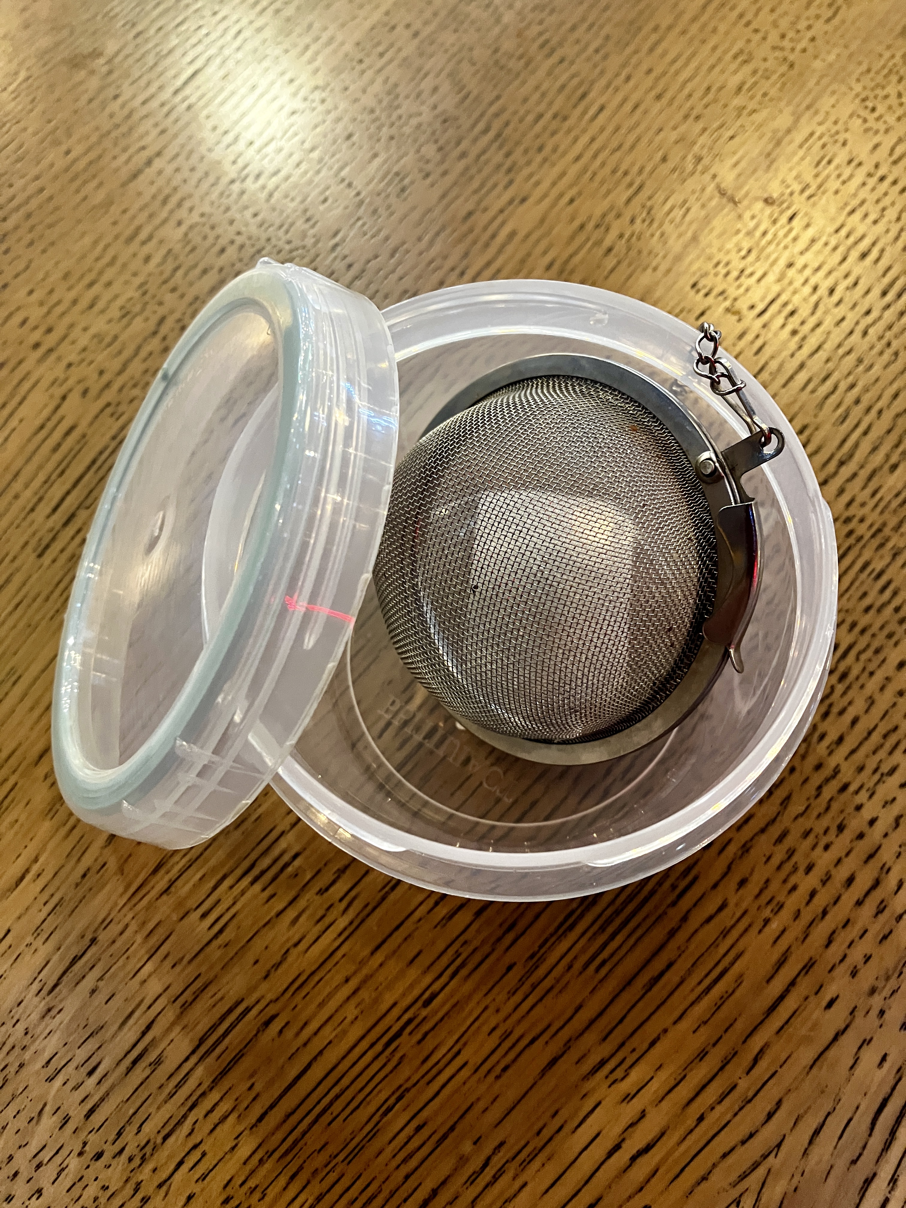 Делюсь технологией заваривания чая. Фотки в блоке. Большое ситечко с замочком (в Ашане - 224 рубля) и пластмассовый круглый контейнер (в Ашане ~ 150 рублей), дабы ситечко не мялось, а чай не протекал бы в сумку. На предмет протекания само ситечко, когда оно с чаем, даже в контейнере лучше убирать в целлофан, потому что контейнер протекает всё равно. Половинка ситечка засыпается чаем, в кружку наливается кипяток, на несколько секунд ситечко с чаем опускается в кружку. Заваривается - моментально, главное - не переборщить! Ориентироваться по цвету. Хватает на 5 - 6 заварок. В зависимости от чая, но в любом случае много. Заваривается очень хорошо! Дегустаторы сказали бы: чай раскрыт. Это много лучше, чем пакетики. По крайней мере, можно пить нормальный чай, тот же Дянь Хун. На Яндекс-маркете он не такой уж и дорогой. И в пакетах вы его не найдете. - (19:15) - Бросив в кружку щепоть с чаем и залив кипятком, так вы его не заварите вообще никогда!
