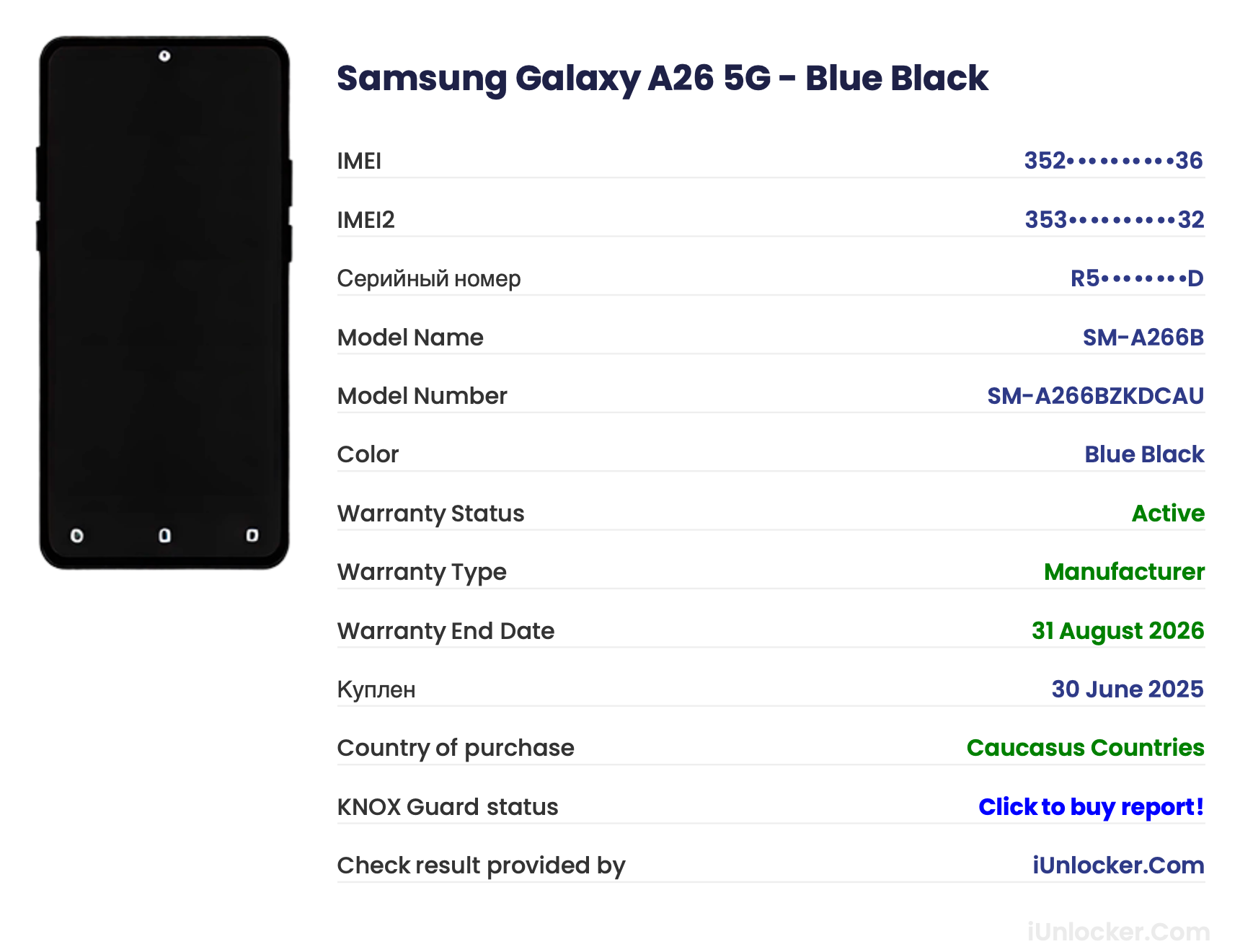 Был в салоне Мегафона. Молодой человек расшифровал строчку гарантии. SM-A266B06128BLK2E1S = SM-A266B (это название модели на коробке) + 06 (это оперативная память) + 128 (это память устройства) + BLK (это «black») + 2E1S (это регион, но почему он такой, никто не знает). Всё это - маркировка у них в системе. - (18:50)