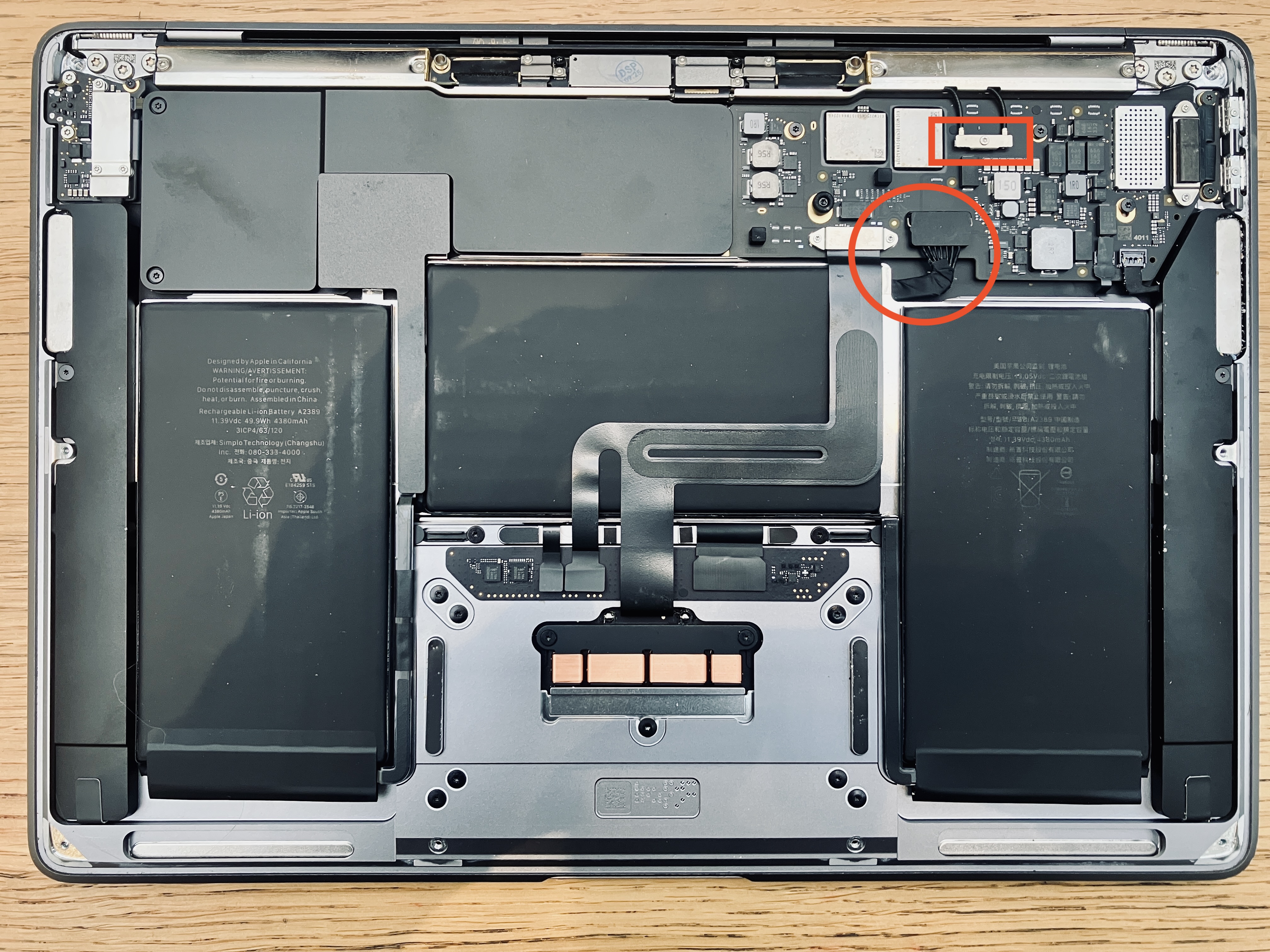 Немножко поработал над фоткой Макбука под крышкой. В круге - место, где отключается аккумулятор, в прямоугольнике - где отключается антенна Wi-Fi. Но едва ли у кого-то есть такие же проблемы, как у меня. - (17:15)