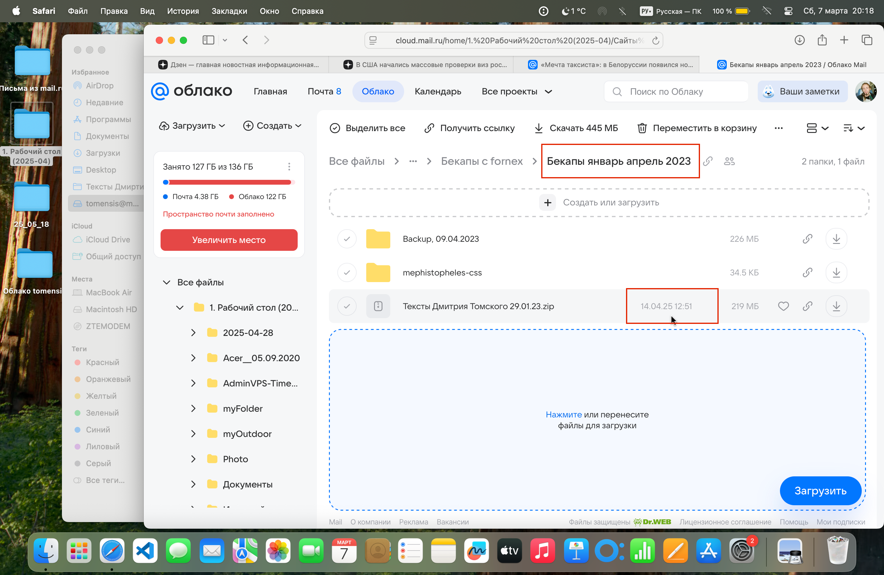 Ну вот, о подменах моих файлов в облаке mail. Скрин в блоке. Zip, датированный январем 2023 года, загружен в облако в апреле 2025-го. - (20:25)