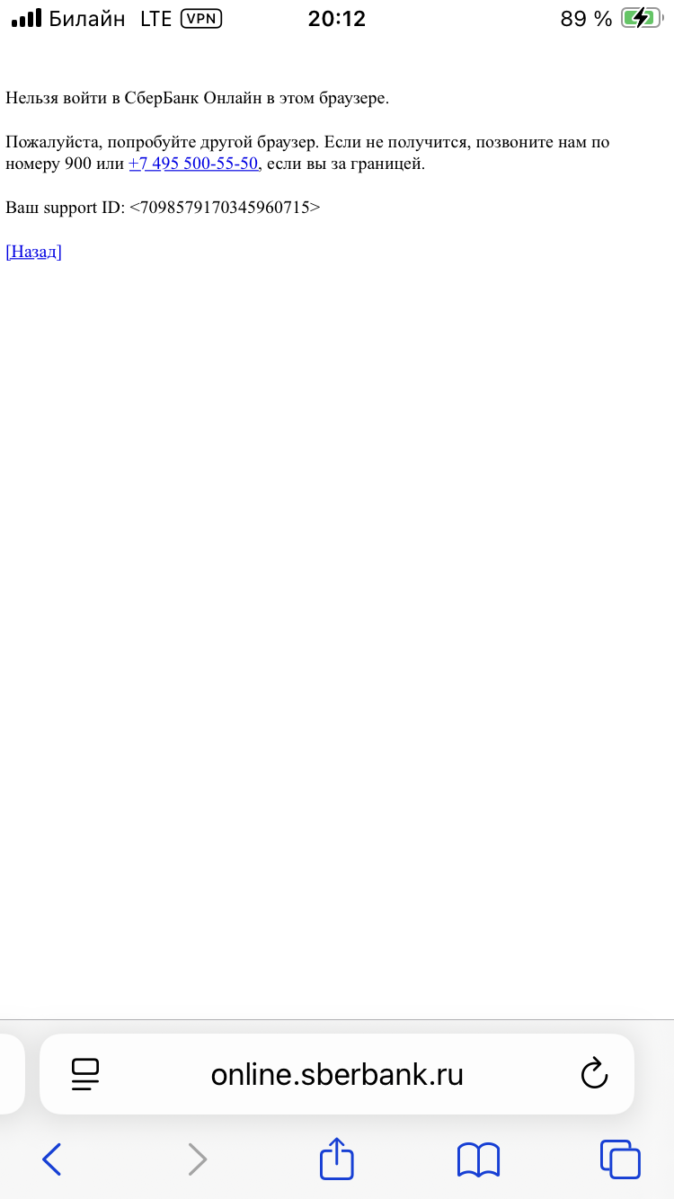 Ну вот как забавно! Я еще и не могу войти в личный кабинет в Сбере с айфона! Уже позаботились. Но только я уже взял справки в Сбере. Причем второй скрин - он о том, как в личный кабинет я уже вошел, и на снимке экрана - всё такой же VPN, как и на первом. - (20:45) - Блин, это просто копечик! Мне бы кто рассказал, что такое происходит с ним, - я бы просто не поверил!