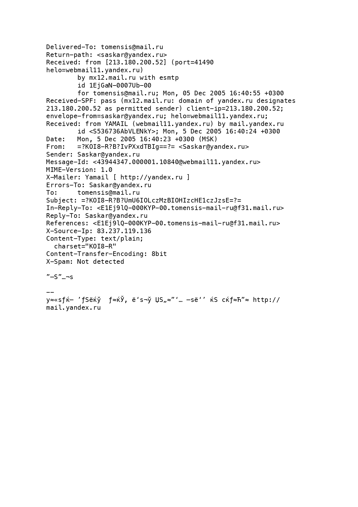 А вот и метаданные. Скрин в блоке. Как видно, charset="K0I8-R". Это нормальная российская кодировка. И та "арабская вязь", составляющая текст письма, на нее не похожа сильно. Такие письма все. И те, на которые отвечают, и те, которые остаются без ответа. И я как-то подозреваю, что письма абсолютно всем приходят в крякозябрах, но если человеку нужно мне ответить - ему пересылают текст в нормальной кодировке. - (23:50)